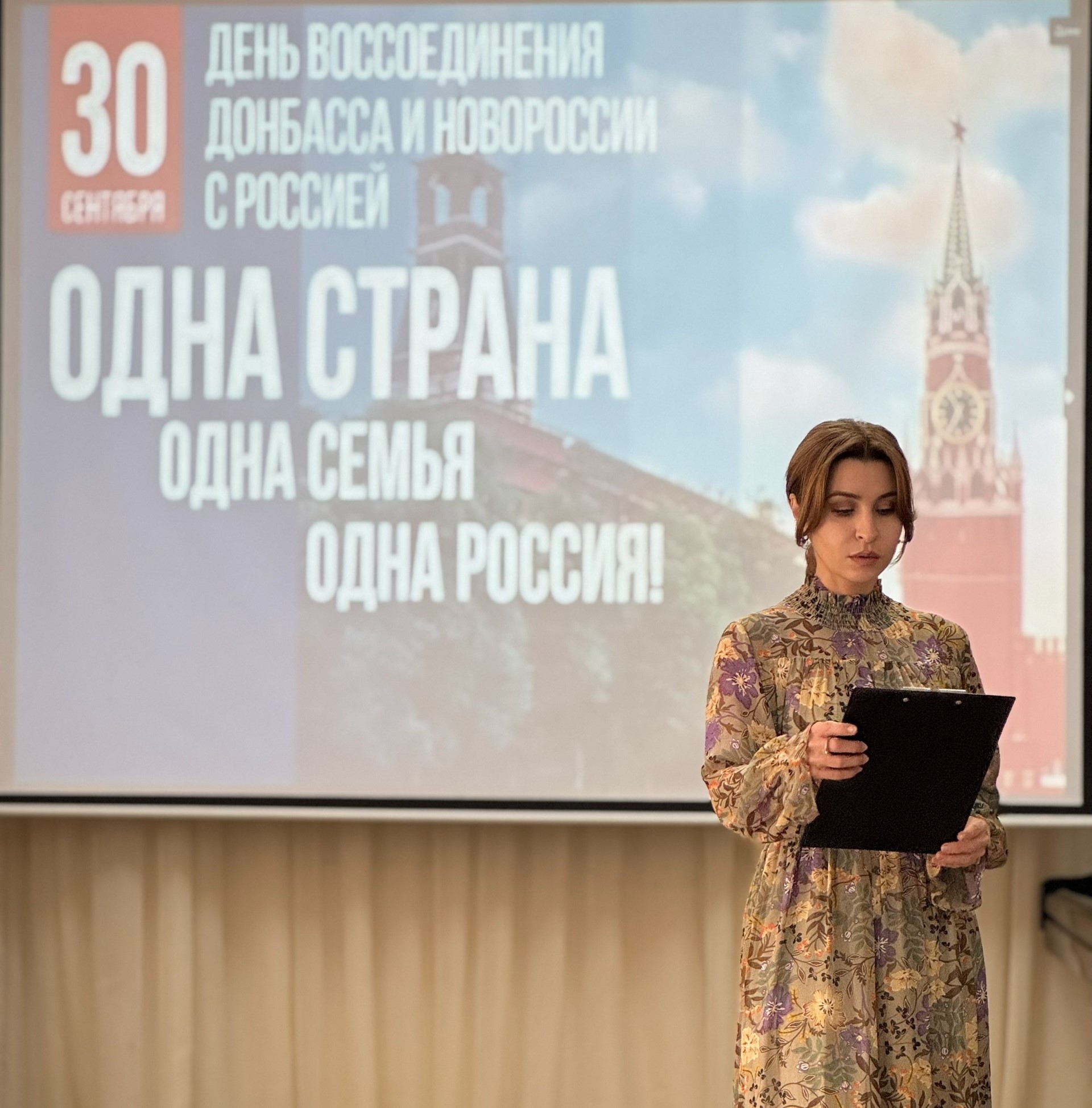 29 сентября Советник директора по воспитанию Гаджиева Зурият Магамедрасуловна провела час познания Отечества «Одна страна. Одна семья. Одна Россия», ко Дню воссоединения ДНР, ЛНР, Запорожской и Херсонской областей с Россией. С помощью видеоролика студенты совершили краткий экскурс в историю, из которого они узнали о событиях, связанных с вхождением новых регионов в состав Российской Федерации. Благодаря референдумам жители Донбасса и Новороссии выразили свое желание жить в составе Российской Федерации, а 30 сентября 2022 года были подписаны договоры с президентом РФ и с главами новых регионов о принятии в состав России. Учащиеся услышали информацию о том, что этот день имеет огромное историческое значение