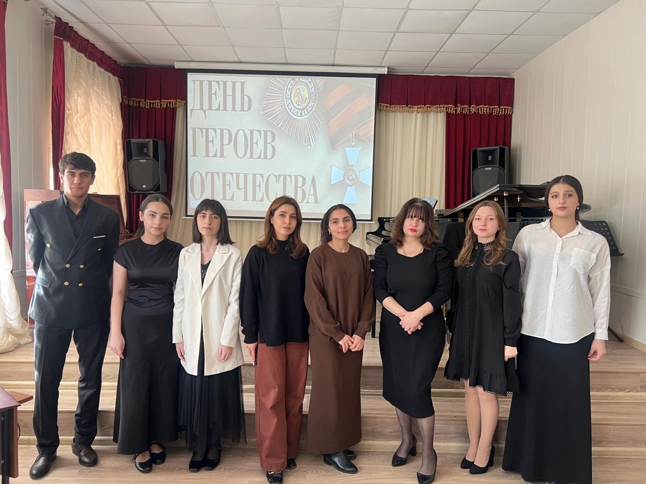 19 декабря в зале Дербентского музыкального училища прошло мероприятие, посвященное Дню Героев Отечества "Гордимся славою героев". Организовали вечер Абдурахманова В. В. и Гаджиева З. М. Стихи прочли Гаджибабаева Асият, Гаджикеримова Фатима, Мирзоева Алия, Ахмедова Хадижа. Прозвучали песни: Ю.Антонова «Маки» и М.Фрадкина «За того парня» из к/ф «Минута молчания» в исполнении Зейналова Низама, Фельцмана «Будь как совесть» в исполнении Гуриной Надежды. Концертмейстер Кадырова Тахмина Салиховна.