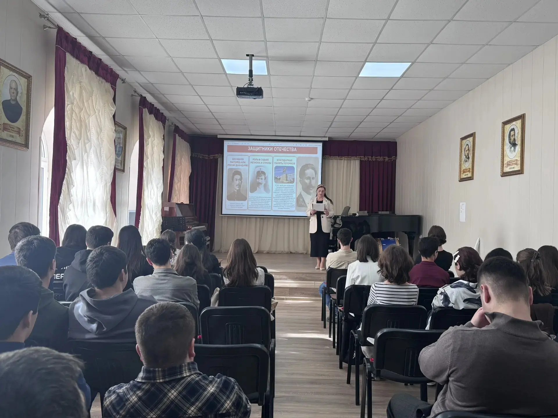 16 февраля в зале ДМУ провели занятие «Разговоры о важном» . Тема занятия «Герой из соседнего двора». Герои – реальные люди, живущие рядом с нами, чья жизнь является примером для окружающих. Настоящие герои во все времена - это те, кто встает на защиту своей Родины и совершает подвиг. Герои республики Дагестан - это люди, чья деятельность повлияла на жизнь других людей, судьбу нашего края и даже всей страны. На занятии говорили о мужестве, о подвигах героев Дахадаева Магомед-Али (Махач Дахадаев), Гаджиева Магомеда Имамутдиновича, Гаджимагомедова Нурмагомеда Энгельсовича. Студенты рассказали о своих «героях из соседнего двора» . Подготовила и провела куратор Ахмедова Г. И.