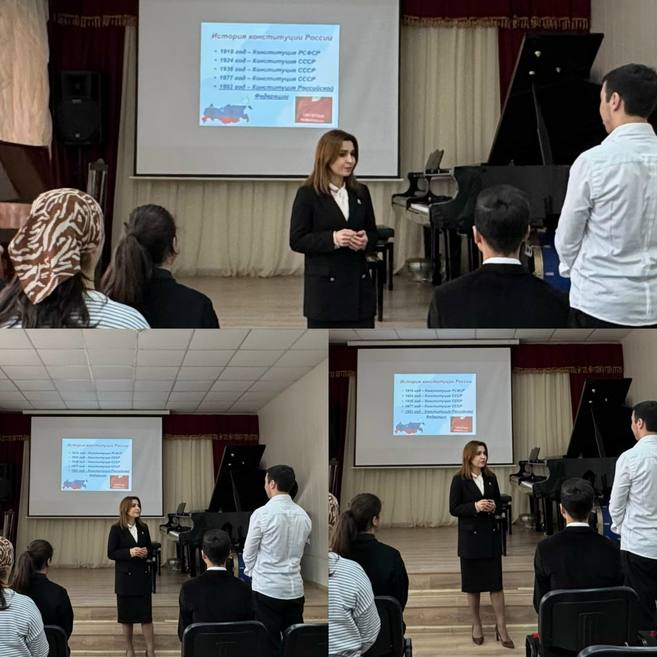 "Конституция - основной закон страны". Единый классный час сегодня был посвящен важному событию - Дню Конституции Российской Федерации Студенты не только вспомнили, но и углубили свои знания о том, что такое Конституция, как и когда она была принята. Советник директора по воспитанию, Гаджиева Зурият Магамедрасуловна рассказала, что именно в этом главном документе страны закреплены самые важные права и обязанности каждого гражданина нашей страны. А так же о том, как сегодня охраняются и соблюдаются статьи основного Закона. Проведенное мероприятия способствует воспитанию гордости за свою страну, развивают чувство гражданственности и патриотизма. |