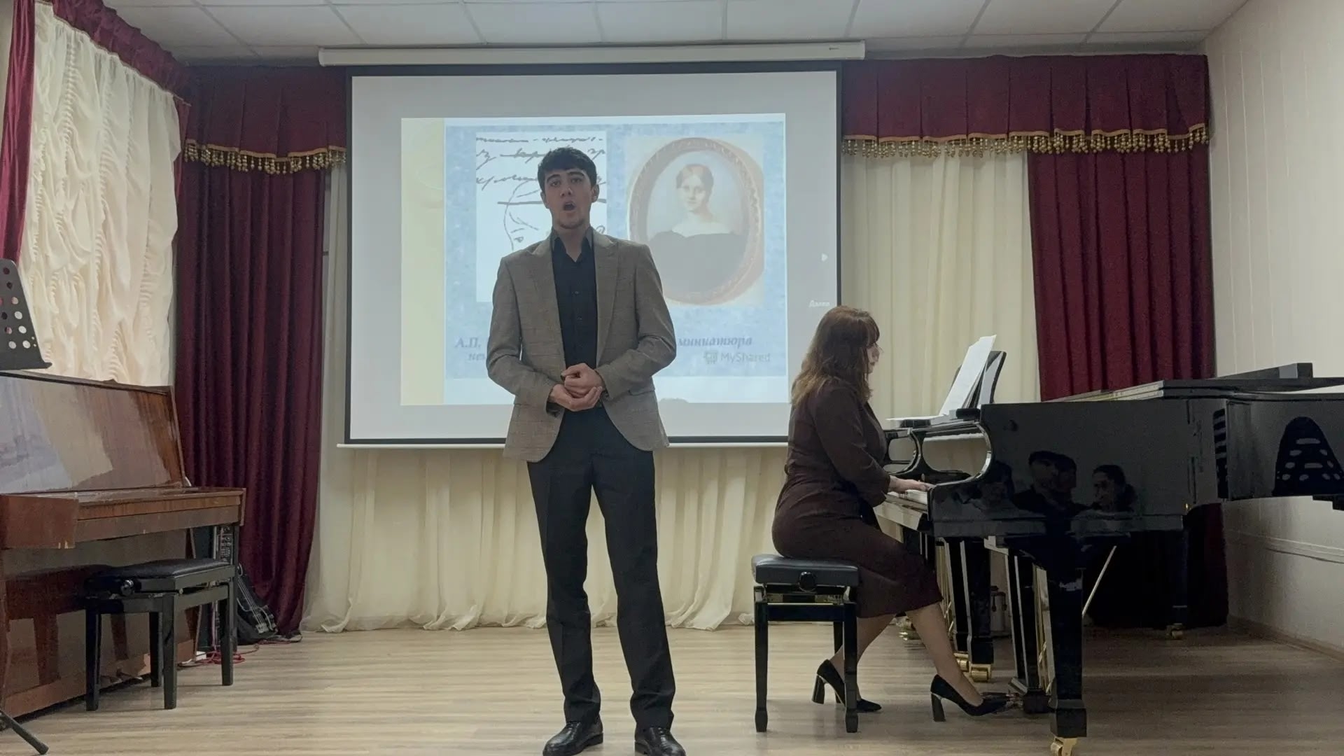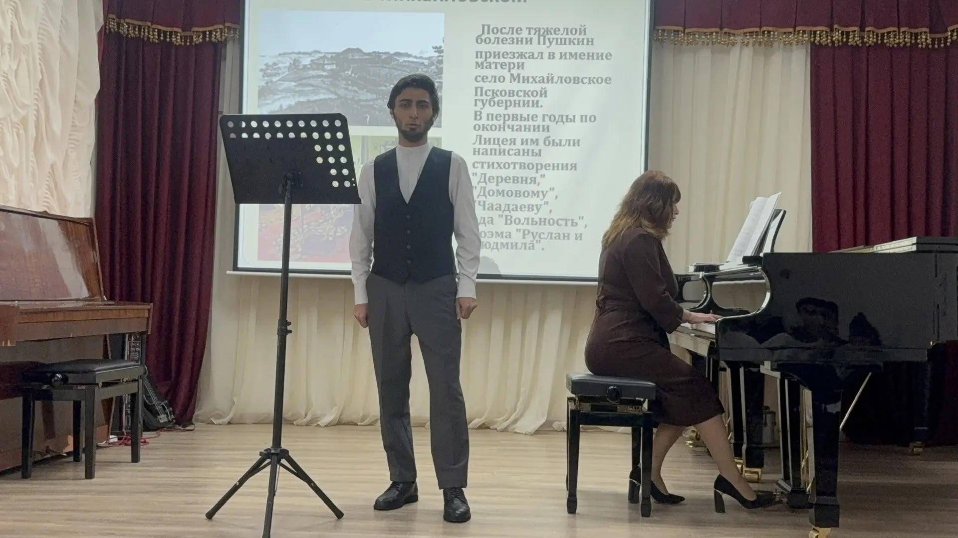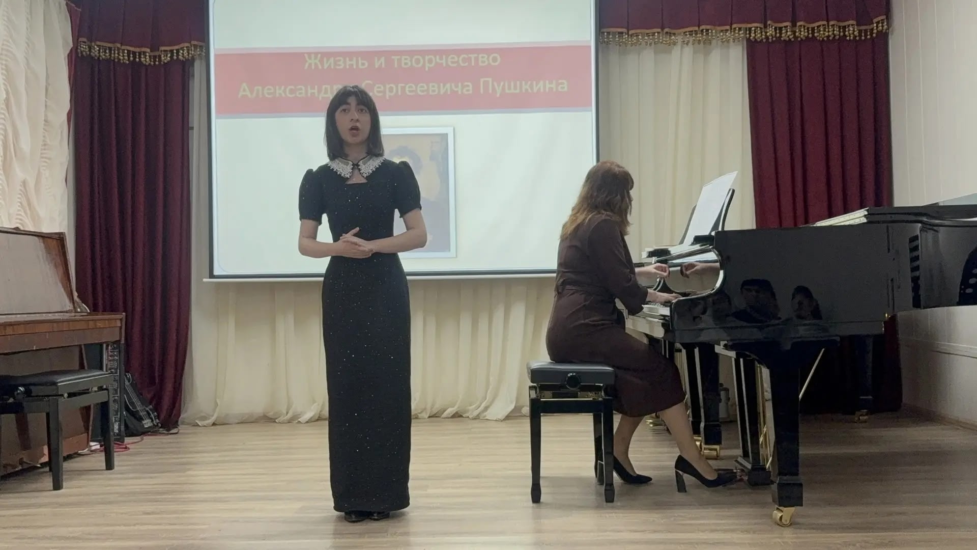 28 февраля на отделении общеобразовательных дисциплин ДМУ прошел Литературный салон, посвящённый Дню памяти А. С. Пушкина. Открыл мероприятие отрывок из кинофильма "Последняя дуэль". Затем студенты проникновенно прочли известные стихи поэта: "Я вас любил", "Элегия", "Мадонна", "Я памятник себе воздвиг нерукотворный", "Мой первый друг, мой друг бесценный" и другие. Студенты исполнили романсы: Гаджибабаева Аиша - "В крови горит огонь желанья", Зейналов Низам - "Я вас любил", Гасанов Али - "Я ехал к вам", "Признание". В заключение директор ДМУ К. Г. Махмудова сказала: "А. С. Пушкин - это кладезь и гордость русской поэзии. Человек, воспевавший родную природу, женщину, любовь к стране. Александр Сергеевич настолько ярко отражал нравы эпохи, что вдохновил композиторов на творчество, поэтому на его стихи написано много романсов, а по мотивам поэм - созданы оперы". Ведущие: Гаджикеримова Фатима и Ахмедова Хадижа. Концертмейстер Т. С. Кадырова. Преподаватели совместно с библиотекарем ДМУ Л. Р. Кулиевой оформили в зале тематическую книжную выставку.