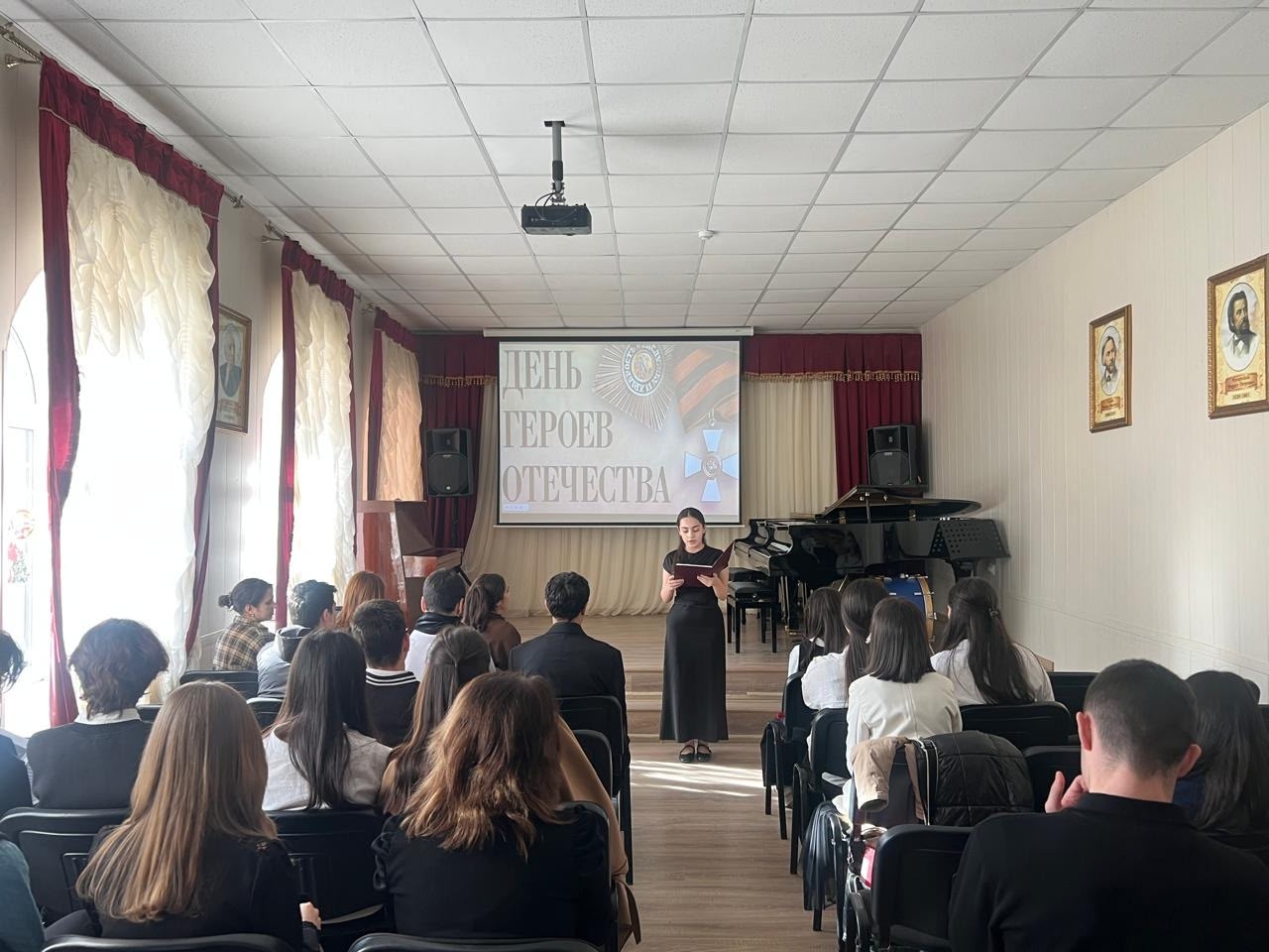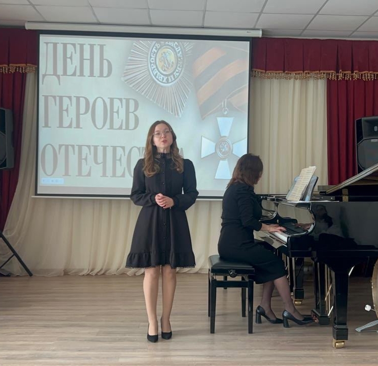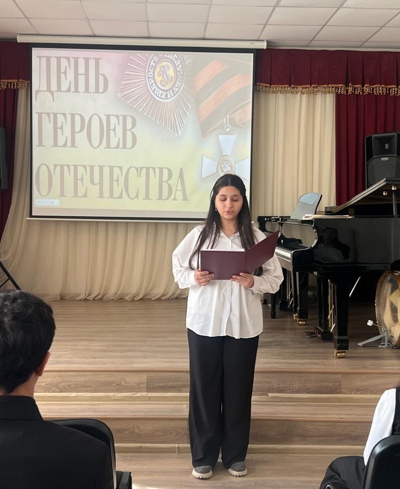 19 декабря в зале Дербентского музыкального училища прошло мероприятие, посвященное Дню Героев Отечества "Гордимся славою героев". Организовали вечер Абдурахманова В. В. и Гаджиева З. М. Стихи прочли Гаджибабаева Асият, Гаджикеримова Фатима, Мирзоева Алия, Ахмедова Хадижа. Прозвучали песни: Ю.Антонова «Маки» и М.Фрадкина «За того парня» из к/ф «Минута молчания» в исполнении Зейналова Низама, Фельцмана «Будь как совесть» в исполнении Гуриной Надежды. Концертмейстер Кадырова Тахмина Салиховна.