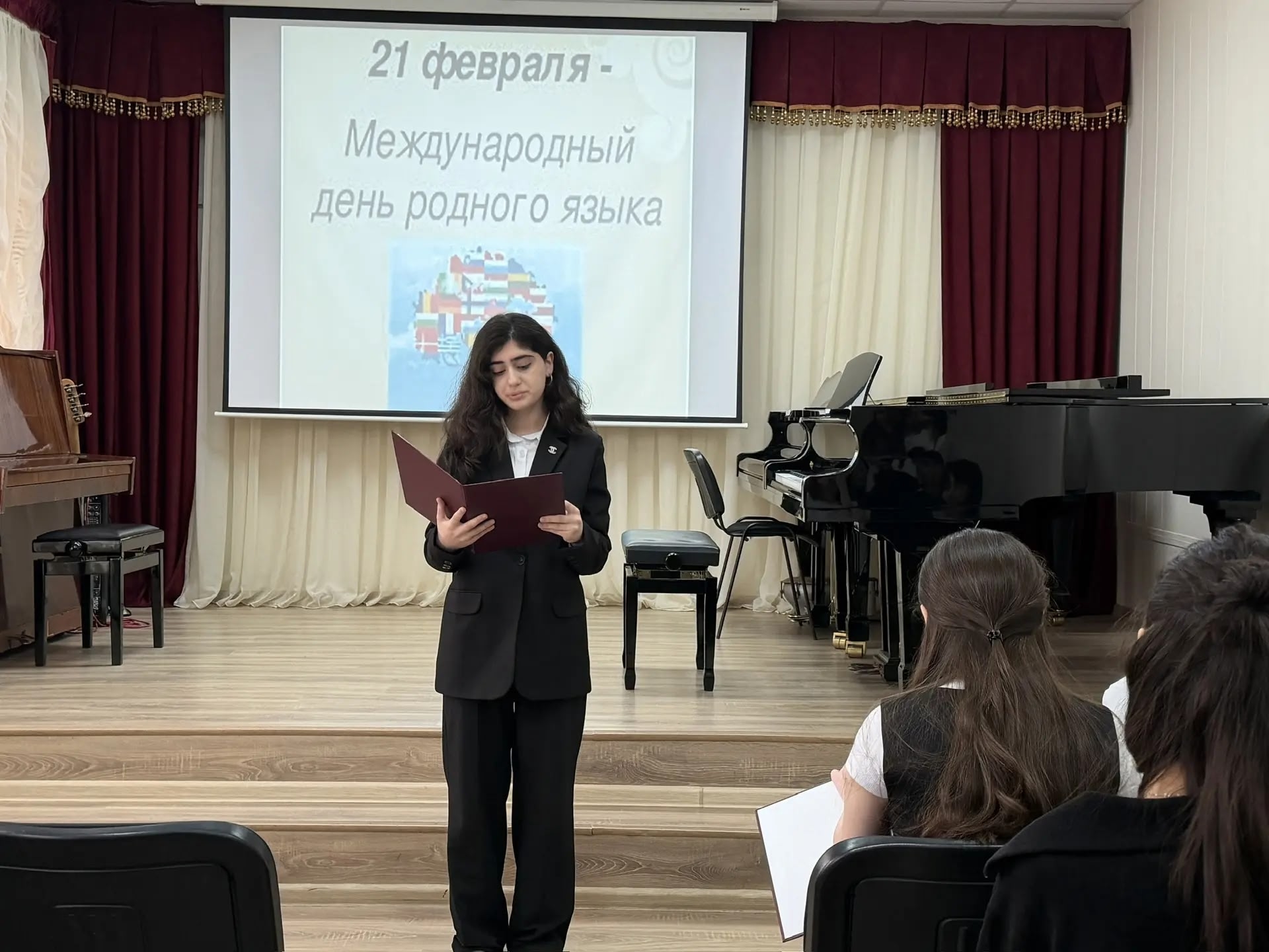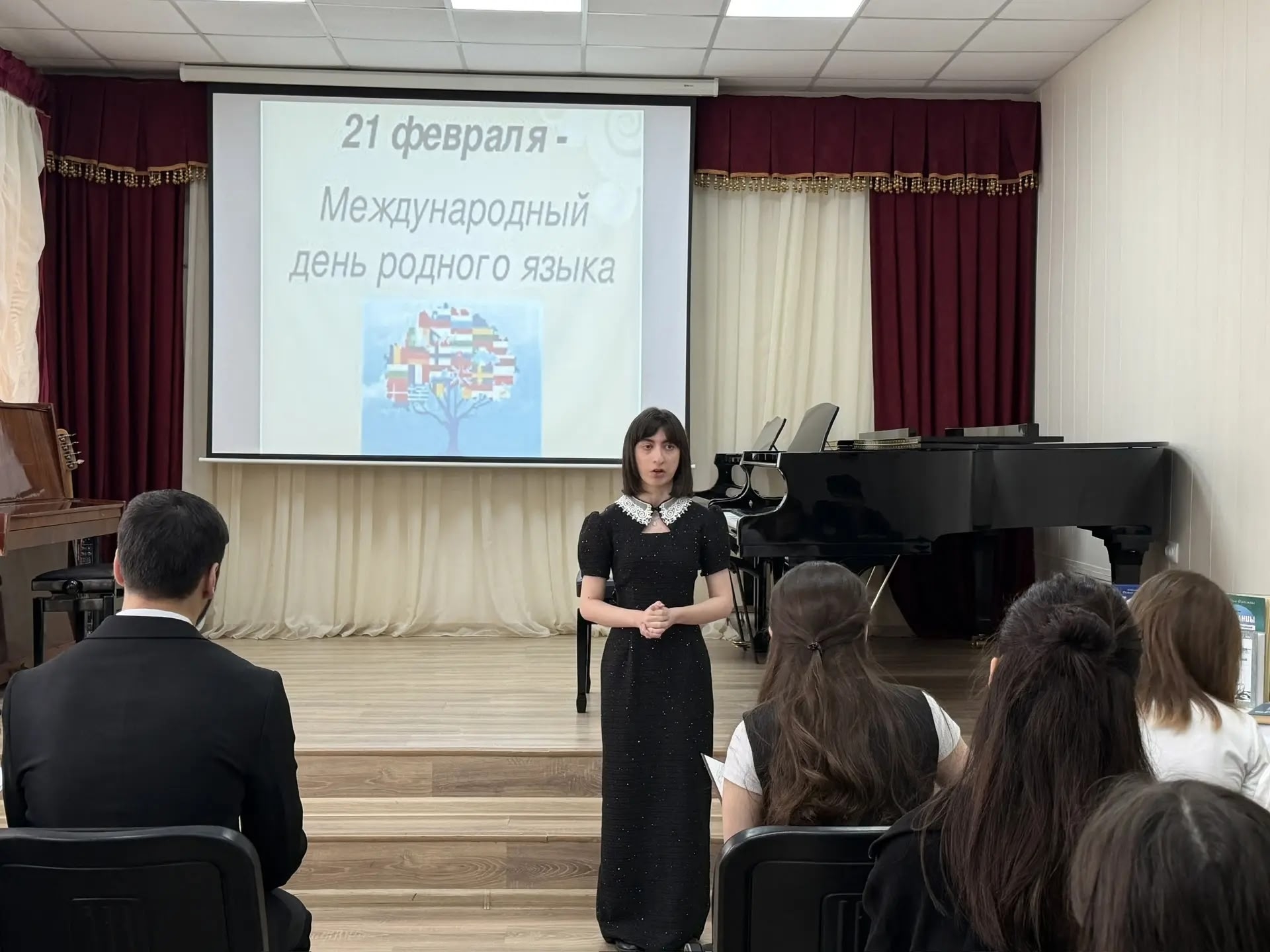 25 февраля на отделении общеобразовательных дисциплин ДМУ прошло мероприятие, посвященное Дню родных языков. Ведущие - студентки Ахмедова Хадижа и Насирова Аида. После просмотра документального фильма о Дагестане, Рзаева Вилаят прочла притчу о языках Дагестана. Прозвучали стихи на родных языках - азербайджанском, лезгинском, табасаранском, стихотворения Расулова Гамзатова. Исполнены песни: Гасанов Али - "Люблю тебя, мой маленький народ", класс преподавателя Багировой С. Д., Асланов Загитдин исполнил лезгинскую народную песню "Алагюзли", класс преподавателя Айрапетян Л. Г., Концертмейстер Кадырова Т. С. Вокально-хоровой ансамбль "Элегия" исполнил "Синерилай" (Луноликая), руководитель Шихмурадова Н. Н., Концертмейстер Шихмурадова З. А. Также выступили ученики ДМШ №1. Прозвучали следующие песни: азербайджанская песня "Сары гялин" исполнила Гусейнова Сабиля, класс преподавателя Багировой С. Д., концертмейстер Абасова Лейла Сабировна. Песню "Мама" на армянском языке исполнила А. Бабаева, класс преподавателя Багировой С. Д., концертмейстер Аллахвердова Н. Я., Ахадов Фарман исполнил "Волшебный поезд" . класс преподавателя Багировой С. Д., концертмейстер Абасова Л. С. Языки являются самыми сильными инструментами сохранения и развития культурного и духовного наследия народа.