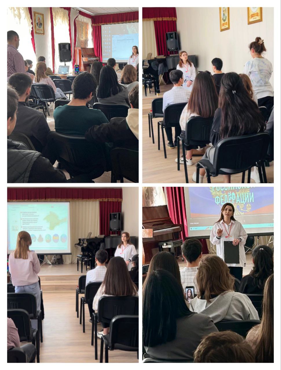 Сегодня, 18 марта, в рамках Дня Воссоединения Крыма и Севастополя к России, советник директора по воспитанию - Гаджиева Зурият Магамедрасуловна провела единый классный час в актовом зале "Дербентского музыкального училища". Рассказала учащимся об истории становления полуострова, об особенностях исторического и культурного единства Крыма с Россией. Начался классный час с Гимна РФ ,затем был показан видеоролик о достопримечательностях, ресурсах и историческом наследии полуострова Крым. Студенты активно отвечали на вопросы, зачитывали информацию о геополитическом значении Крыма в истории и современности нашей страны. Целью данного мероприятия было воспитание любви к своему Отечеству, проявления уважения к истории России и гордости за свою страну и ее народ.