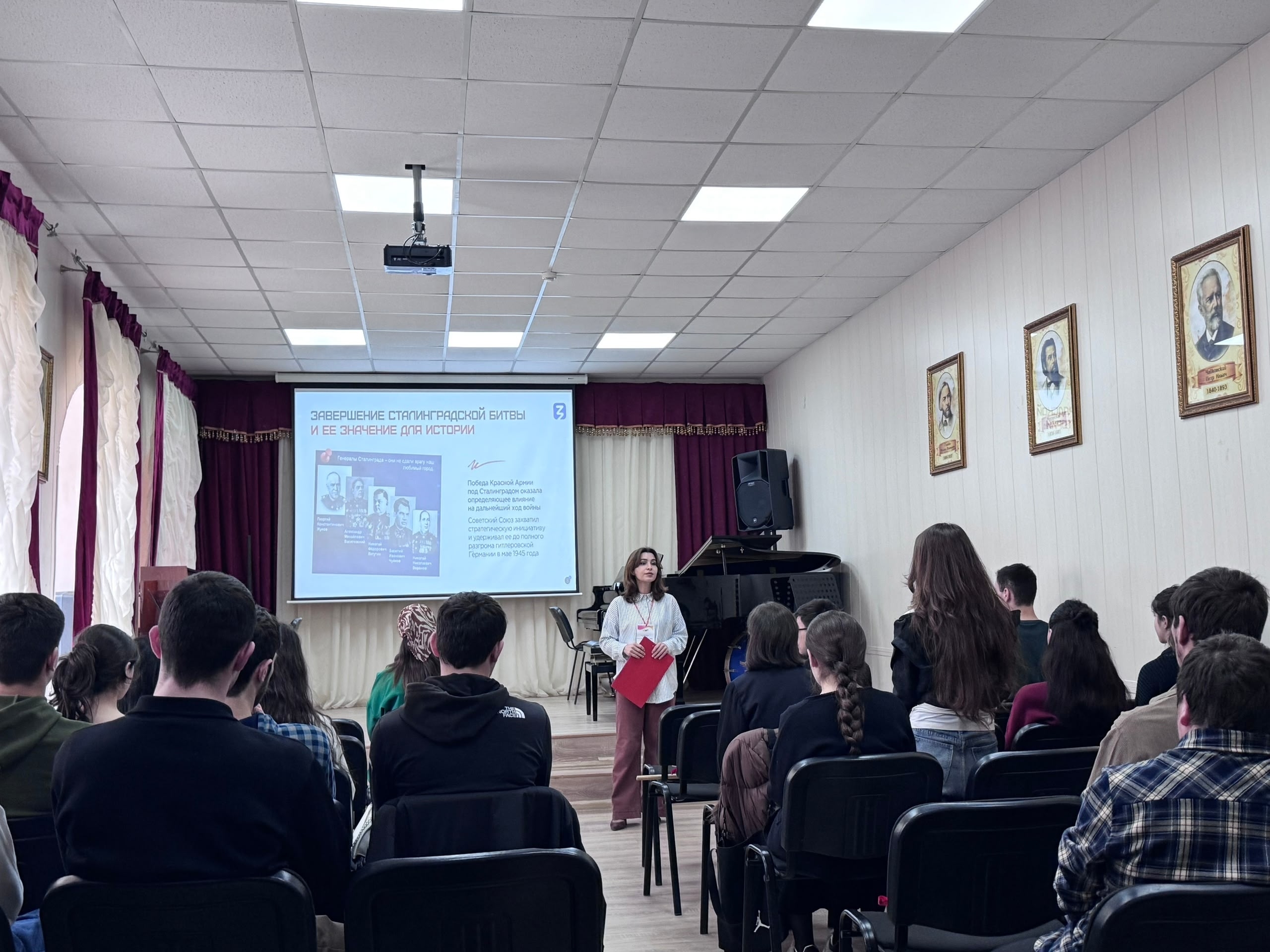 2 февраля советник директора Зурият Гаджиева провела лекцию, посвящённую Дню разгрома советскими войсками немецко-фашистских войск в Сталинградской битве (1943 год) для студентов. Тема предложена федеральным государственным бюджетным учреждением «Российский детско-юношеский центр» и Общероссийской общественно-государственной просветительской организацией «Российское общество Знание». Учащиеся 1-4 курсов с интересом слушали лекцию, отвечали на вопросы, а также вспомнили важные даты истории нашей страны в годы ВОВ. Лекция сопровождалась презентацией и интерактивными приложениями, которые позволяют лучше воспринимать информацию и запоминать её. Лекция позволила лучше узнать историю своего края, своего народа и других народов России.