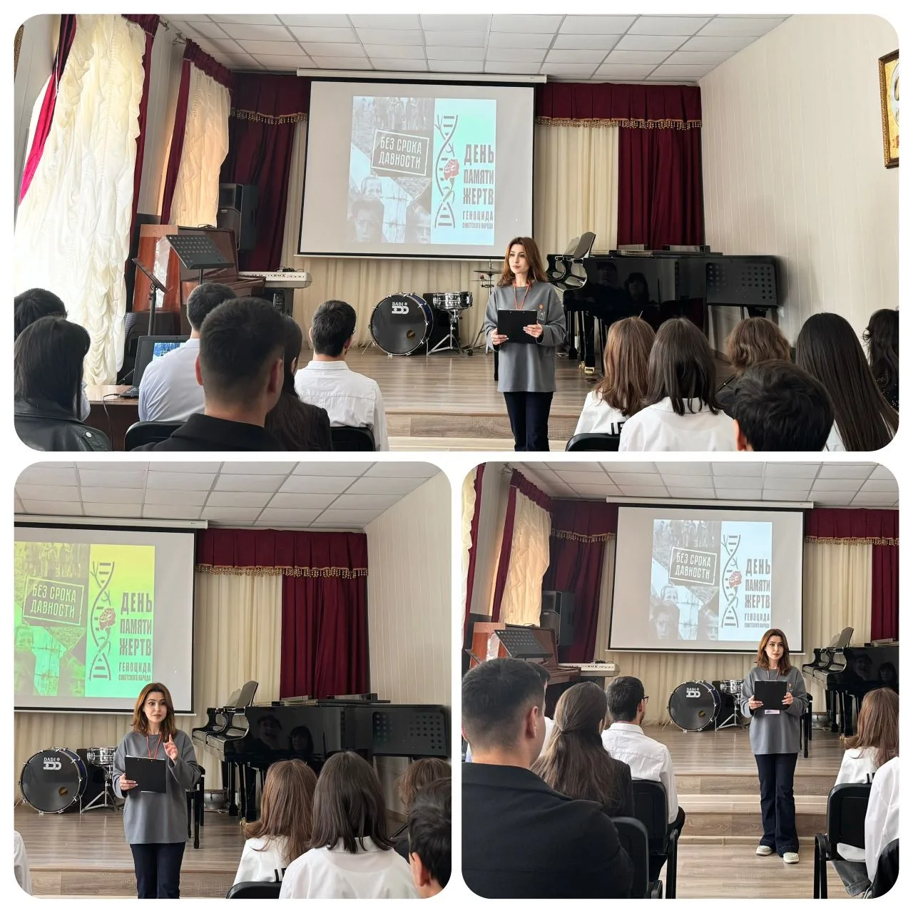 17 апреля, в рамках Дня единый действий памяти жертв геноцида против советского народа в годы ВОВ, в ДМУ состоялся единый классный час. Участниками часа памяти «Без срока давности» стали студенты 1-4 курсов. Классный час провела советник директора по воспитанию Гаджиева З.М. Учащиеся узнали некоторые факты о трагедии мирного населения СССР в период Великой Отечественной войны. Преподаватель разъяснила понятия «геноцид», «нацизм» и чем они отличаются от военных боевых действий и террористических актов. Через призму исторической памяти, было рассказано о преступлениях, совершённых нацистами и их пособниками, против советского населения в годы Великой Отечественной войны, которые имели все признаки геноцида. Обс