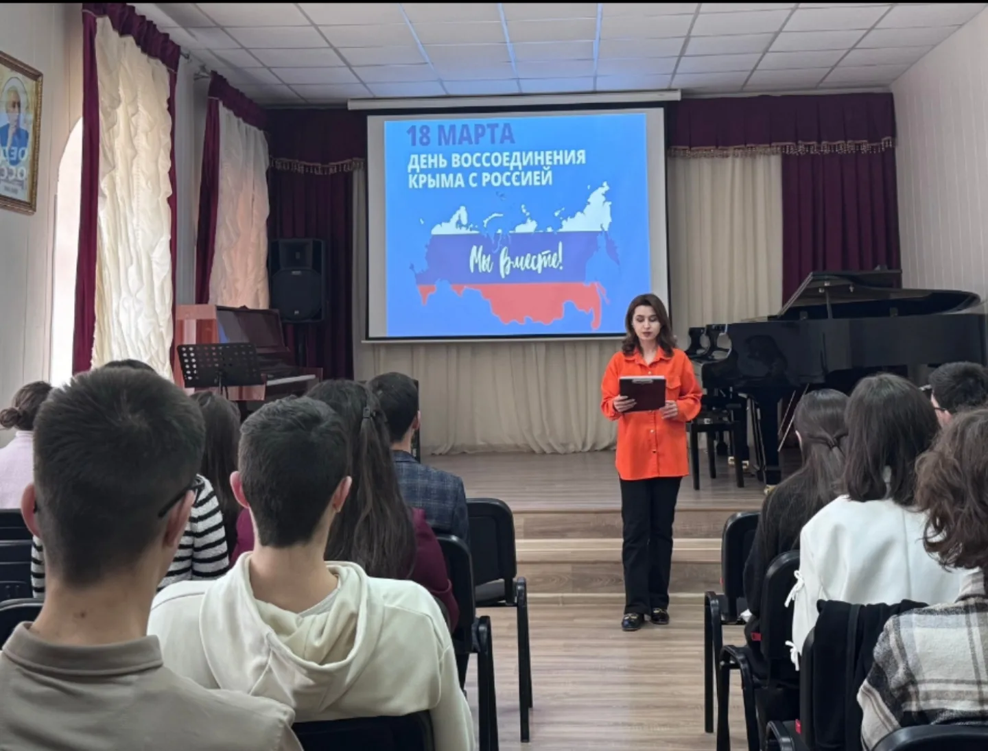 День воссоединения Крыма и города Севастополя с Россией отмечается в нашей стране 18 марта. В этот день в 2014 году Крым официально вошёл в состав Российской Федерации. Присоединение Республики Крым в состав России было зафиксировано межгосударственным договором, подписанным в Георгиевском зале Большого Кремлёвского дворца в Москве главами России и Республики Крым. В течение классного часа студенты узнали о ключевых этапах «Крымской весны» и итогах референдума 2014 года, а также о подписании межгосударственного договора. Советник директора по воспитанию Гаджиева З.М. продемонстрировала документальные кадры и видеоролики, в которых рассказывалось о богатой историю полуострова и его современном потенциале: развитие экономики, культуры