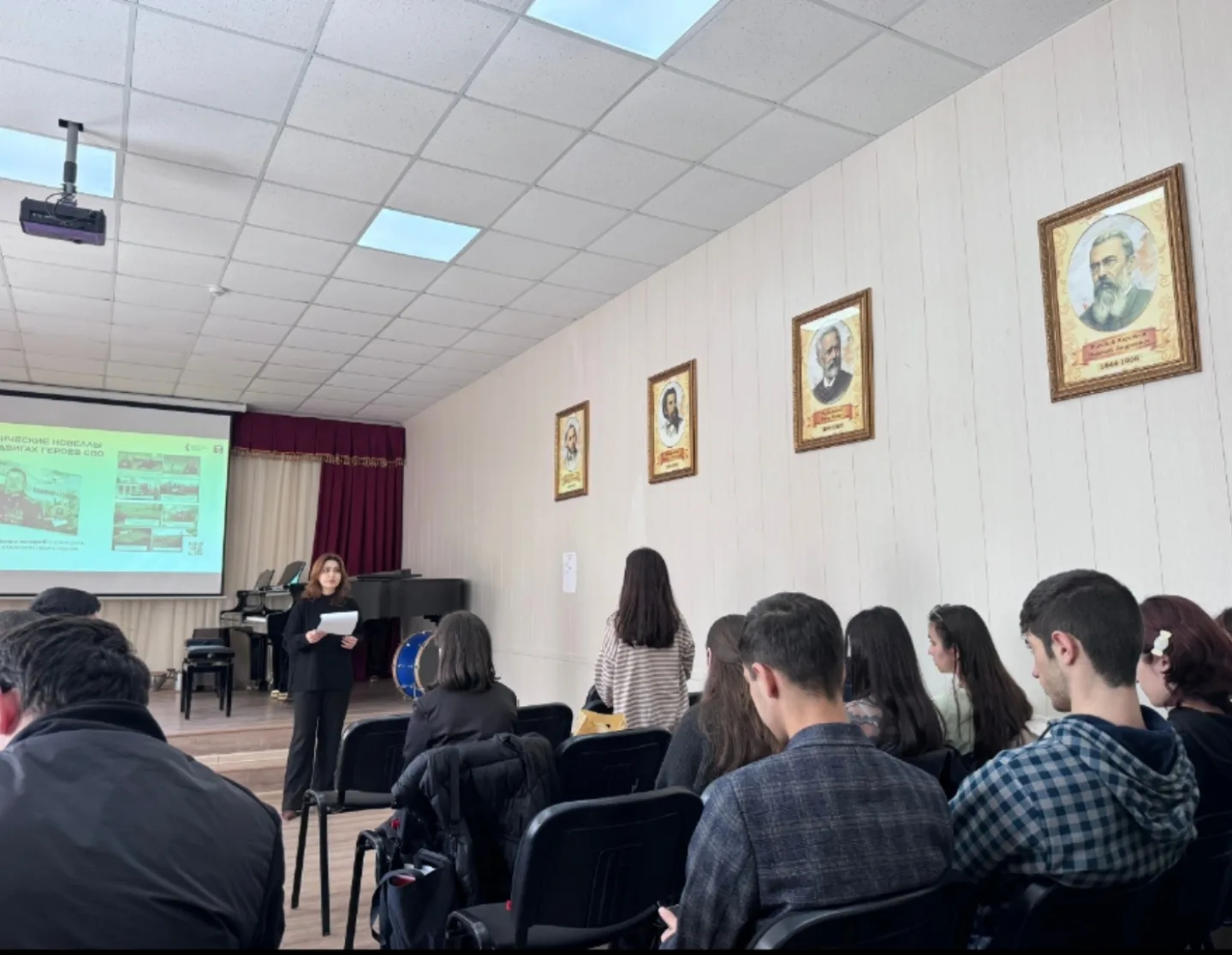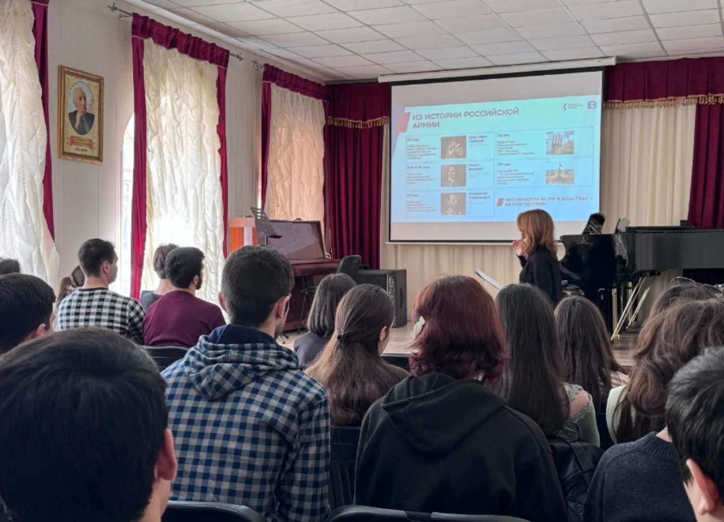 14 марта в Дербентском музыкальном училище был проведен единый классный час со студентами 1-4 курсов. Советник директора по воспитанию Гаджиева Зурият Магамедрасуловна провела лекцию и рассказала студентам о суверенитете страны, ведущей роли вооружённых сил в защите суверенитета России. В ходе лекции учащиеся узнали истории бойцов Специальной военной операции, какие вооружённые силы России стоят на защите Родины и народа, какие ведомства обеспечивают внутреннюю безопасность государства. В течение классного часа, обсудили как обычный человек становится героем. Геройство и мужество наших бойцов учат нас тому, что любовь к Родине измеряется не словом, а поступками.