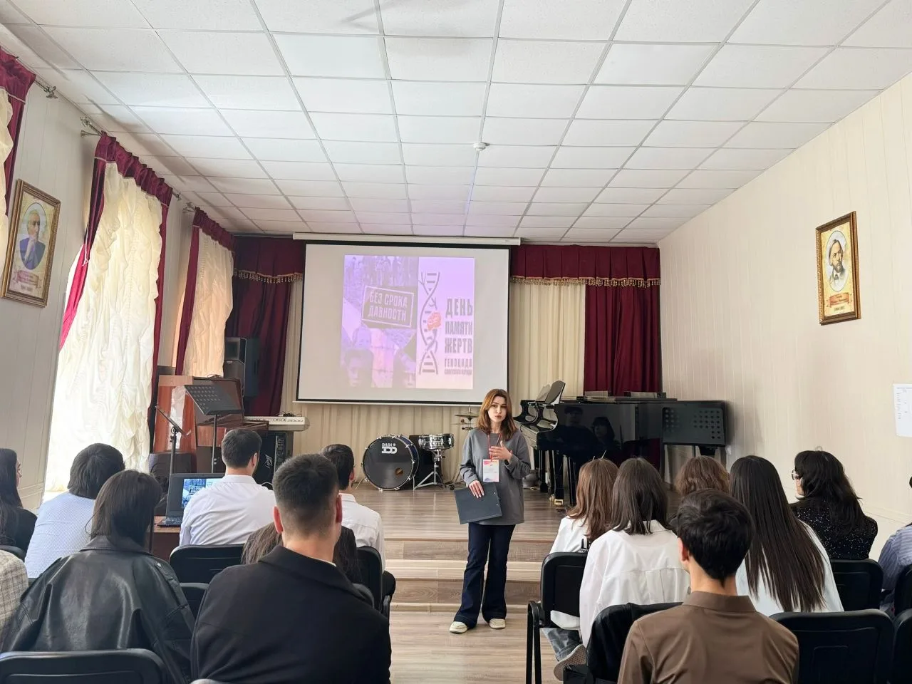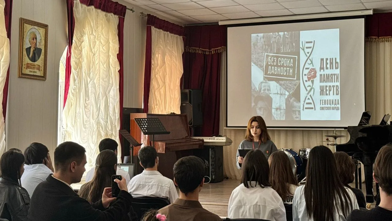 17 апреля, в рамках Дня единый действий памяти жертв геноцида против советского народа в годы ВОВ, в ДМУ состоялся единый классный час. Участниками часа памяти «Без срока давности» стали студенты 1-4 курсов. Классный час провела советник директора по воспитанию Гаджиева З.М. Учащиеся узнали некоторые факты о трагедии мирного населения СССР в период Великой Отечественной войны. Преподаватель разъяснила понятия «геноцид», «нацизм» и чем они отличаются от военных боевых действий и террористических актов. Через призму исторической памяти, было рассказано о преступлениях, совершённых нацистами и их пособниками, против советского населения в годы Великой Отечественной войны, которые имели все признаки геноцида. Обсудили необходимость сохранения исторической памяти. Обучающиеся посмотрели документальный фильм «Дети войны». Фильм – не хроника событий, а глубокое погружение в воспоминания и переживания тех, кто в детском возрасте столкнулся с ужасами войны. В фильме студенты из первых уст услышали личные истории людей, которые, будучи детьми, стали свидетелями страшных событий, происходивших в годы Великой Отечественной войны Час памяти — важное напоминание о том, как хрупка мирная жизнь и как важна память о героическом подвиге нашего прошлого.