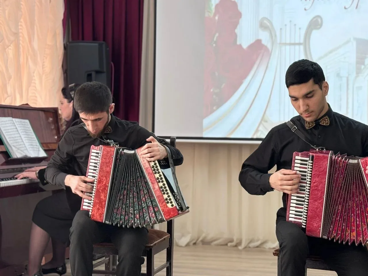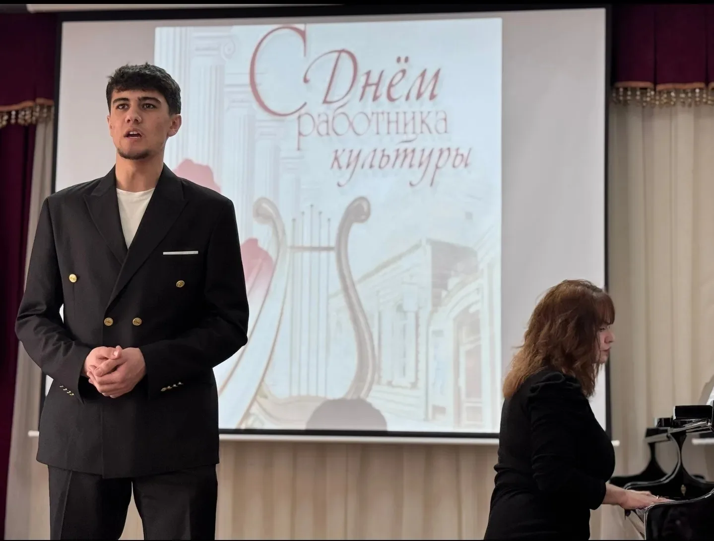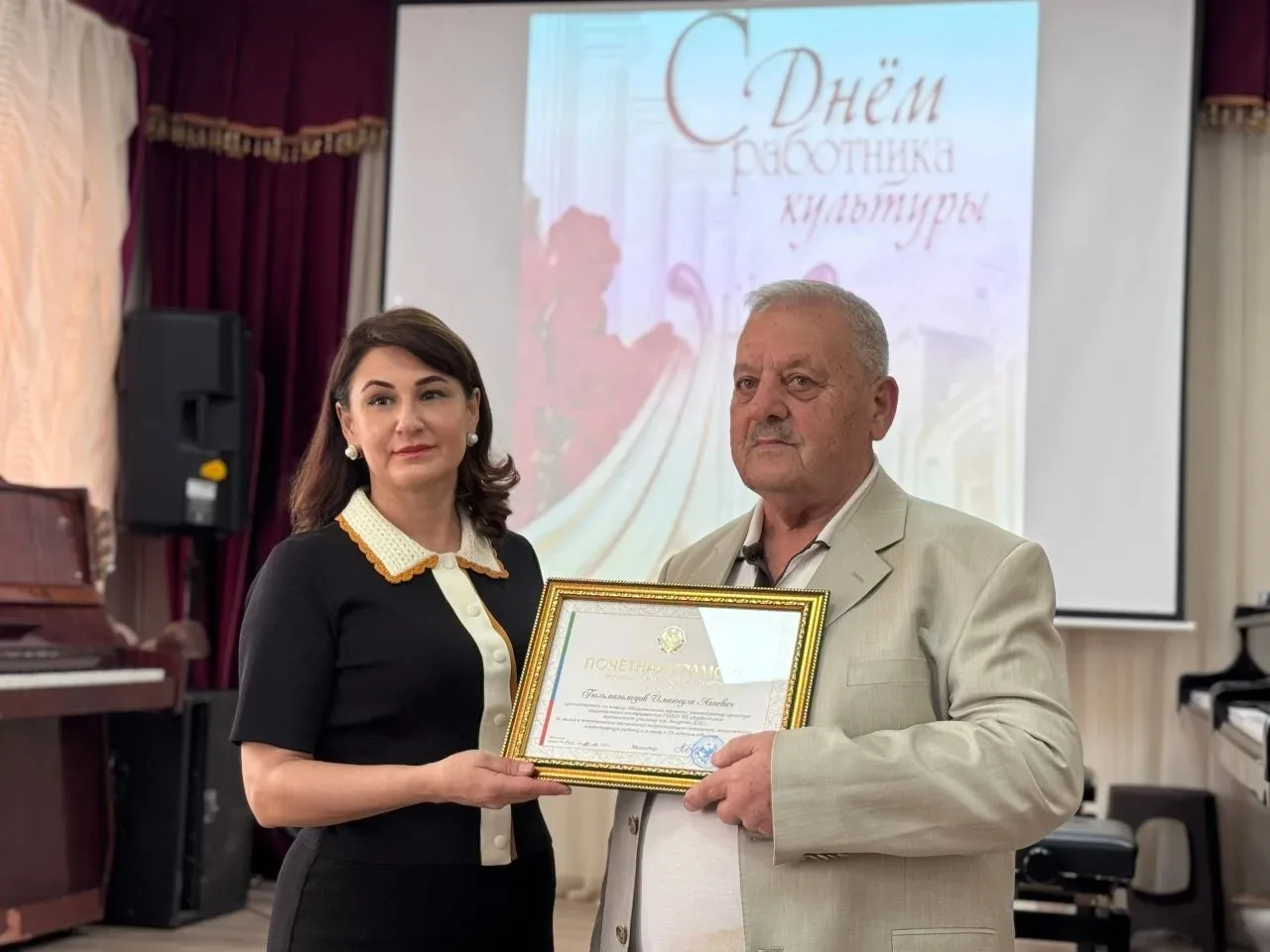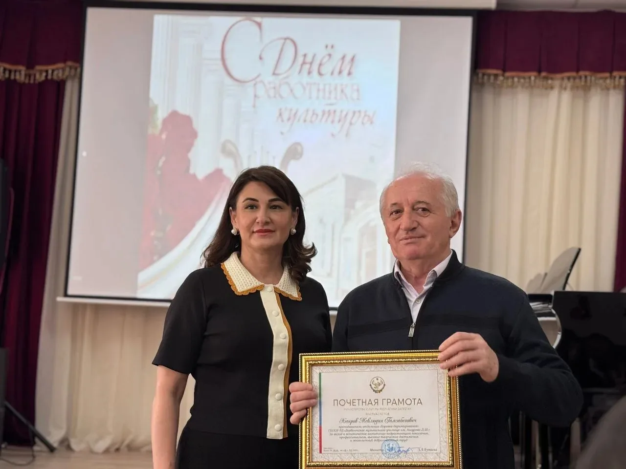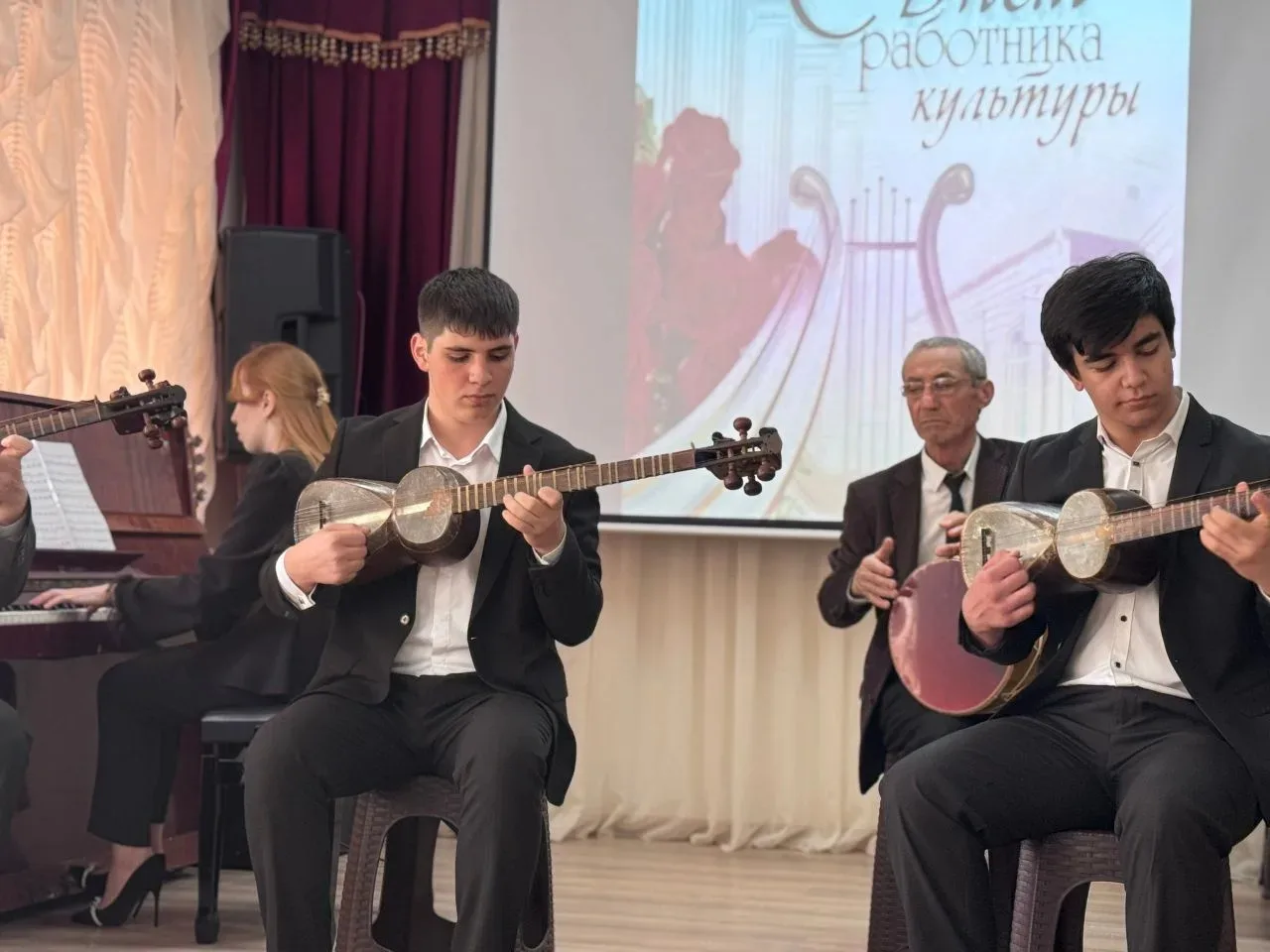 25 марта в актовом зале Дербентского музыкального училища состоялся праздничный концерт ко Дню работника культуры Ведущие, студентки отделения «Фортепиано» - Ахмедова Хадижа и Рзаева Вилаят, поздравили педагогов и студентов с праздником и предоставили слово директору училища, заслуженному работнику культуры РД Махмудовой Камиле Гаджимурадовне, которая вручила Почетные грамоты министра культуры РД педагогам, заслуженным работникам культуры РД - Гюльмагомедову Иманулле Агаевичу и Хаирову Мавлюдину Гамзабековичу. Силами педагогов и студентов были подготовлены красочные и колоритные номера. В программе концерта прозвучали произведения русских и дагестанских композиторов. В концерте участвовали: -ансамбль и солист отделения «СХНП», -ансамбль таристов и ансамбль гармонистов отделения «Народные инструменты», -фортепианный дуэт -квартет педагогов. Мероприятие прошло в теплой и уютной атмосфере. Организатор концерта Гаджиева Зурият Магамедрасуловна - советник директора по воспитанию.